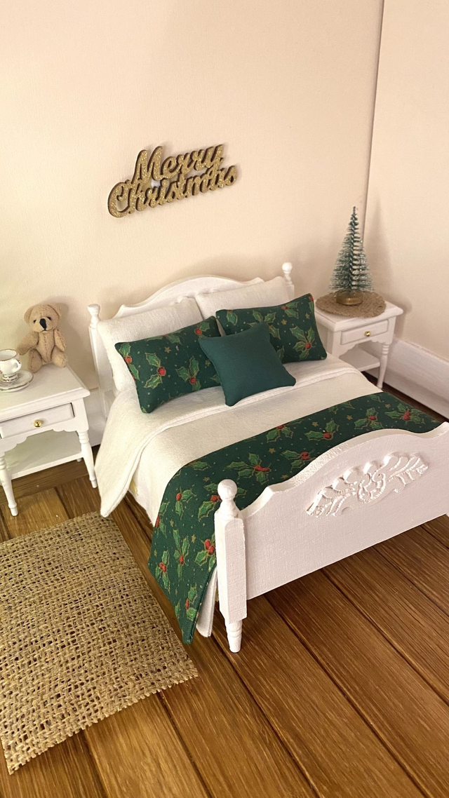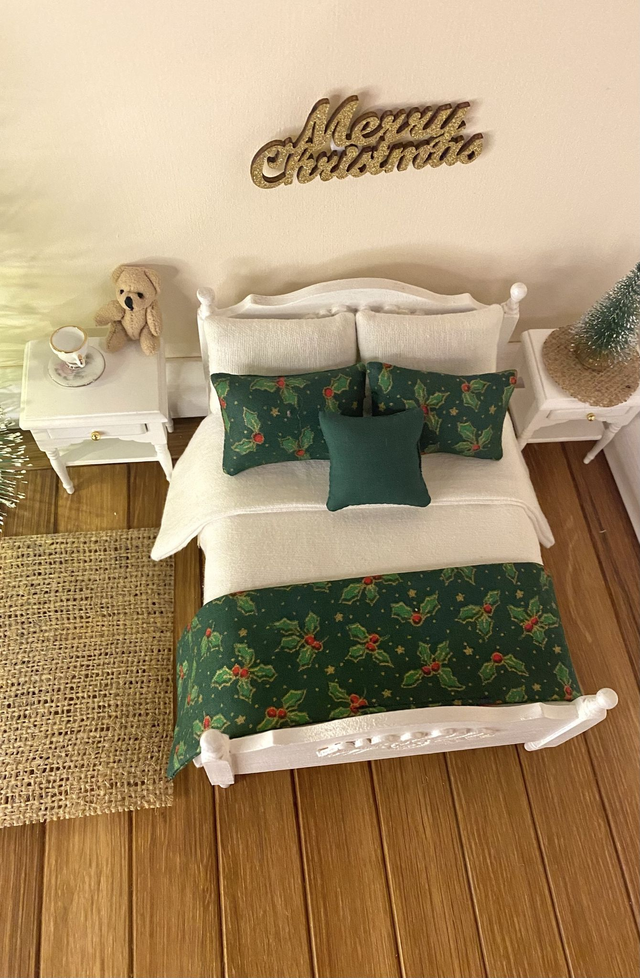Festive miniature Christmas bed set with green and gold holly accents for 1:12 scale doll house/ diorama