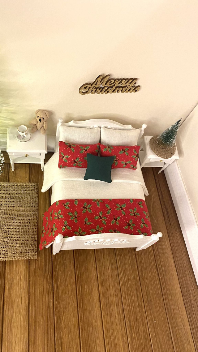 Festive miniature Christmas bed set with red, green and gold holly accents for 1:12 scale doll house/ diorama