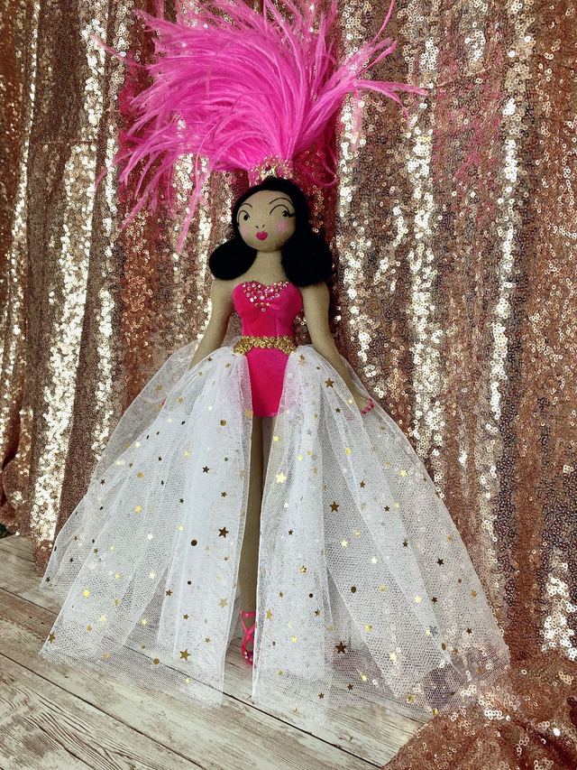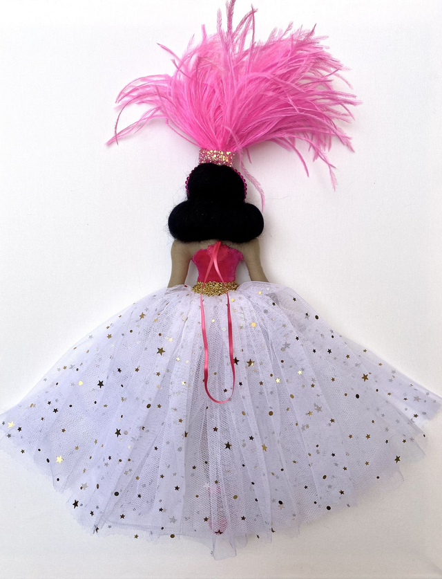 This divinely glamorous showgirl is ready to step onto the stage in her pink ostrich feather headdress. Lola wears a hot pink velvet costume adorned with Swarovski and Preciosa rhinestones and sumptuous gold starred skirts. She has hand-embroidered features and a ‘50s style hairdo in Scottish wool.
